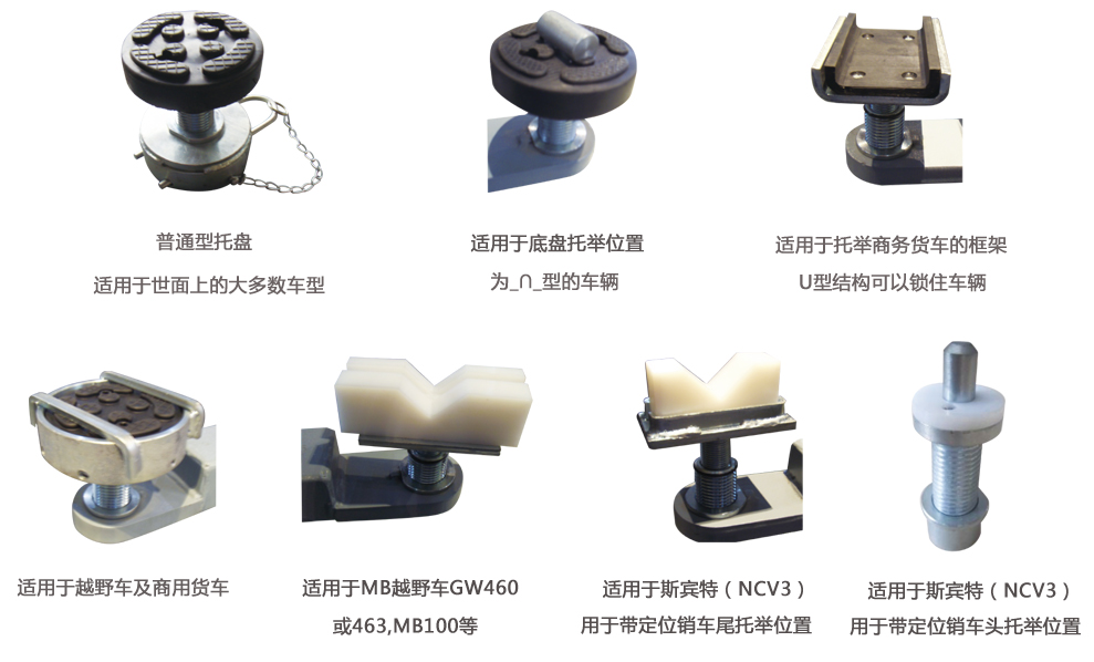 · 底盤支撐件:不同類型車輛的底盤結構各不相同,常用的橡膠托墊無法適用時,則需根據選擇適用的托盤支撐件(詳見下圖)