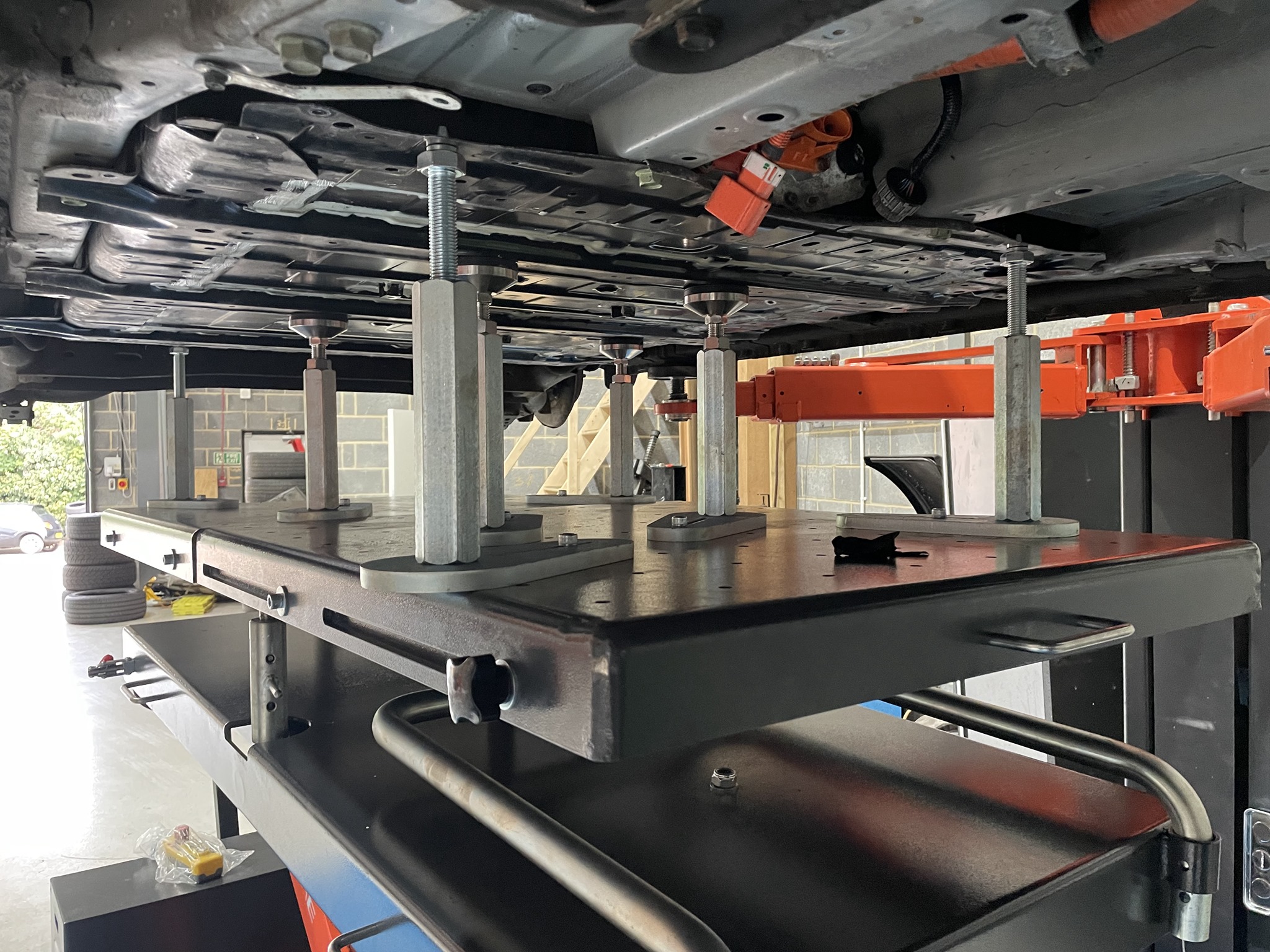 · 輪胎托舉支架:當遇到車輛托舉點不匹配的情況,輪胎托舉支架可從普通的底盤接觸快速轉變為輪胎接觸,并能快速切換回來。尤其適合新能源汽車,使車輛整個底盤暴露在外,讓電池更換的作業空間變大。