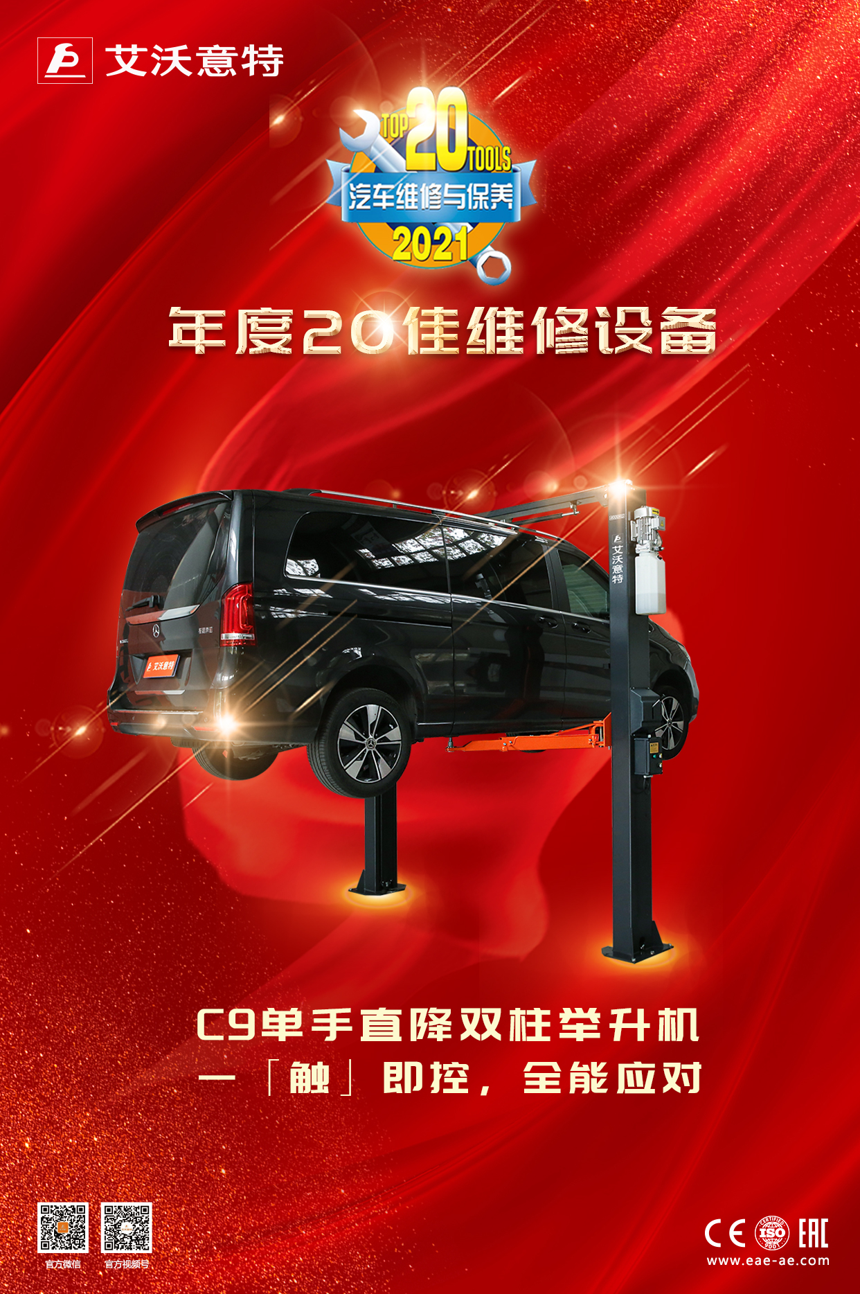 艾沃意特C9雙柱舉升機,創新的操作系統,在操作上化繁為簡,僅單手即可實現直接解鎖下降,符合20佳“創新、實用、高效”的評選宗旨,經過線上用戶投票以及現場專家評審團廣泛認可,榮獲年度20佳維修設備。